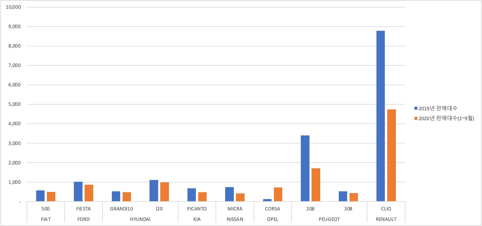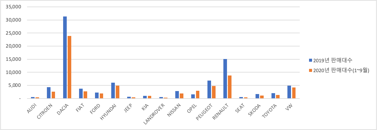 전통적인 저가 시장의 강자 DACIA가 부동의 1위를 차지하고 있으나 코로나 여파로 인한 것인지 거의 대부분의 브랜드는 주춤하고있으나,